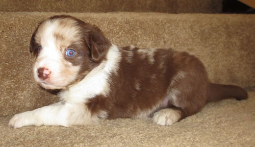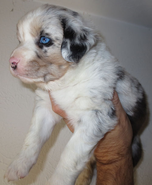**SOLD** Puppy #3: FEMALE, Red Merle, TWO BLUE EYES!, incredibly intelligent, active and outspoken - a true alpha puppy, and very rare from the offspring of Black/white+Blue Merle - This dog has great genes.